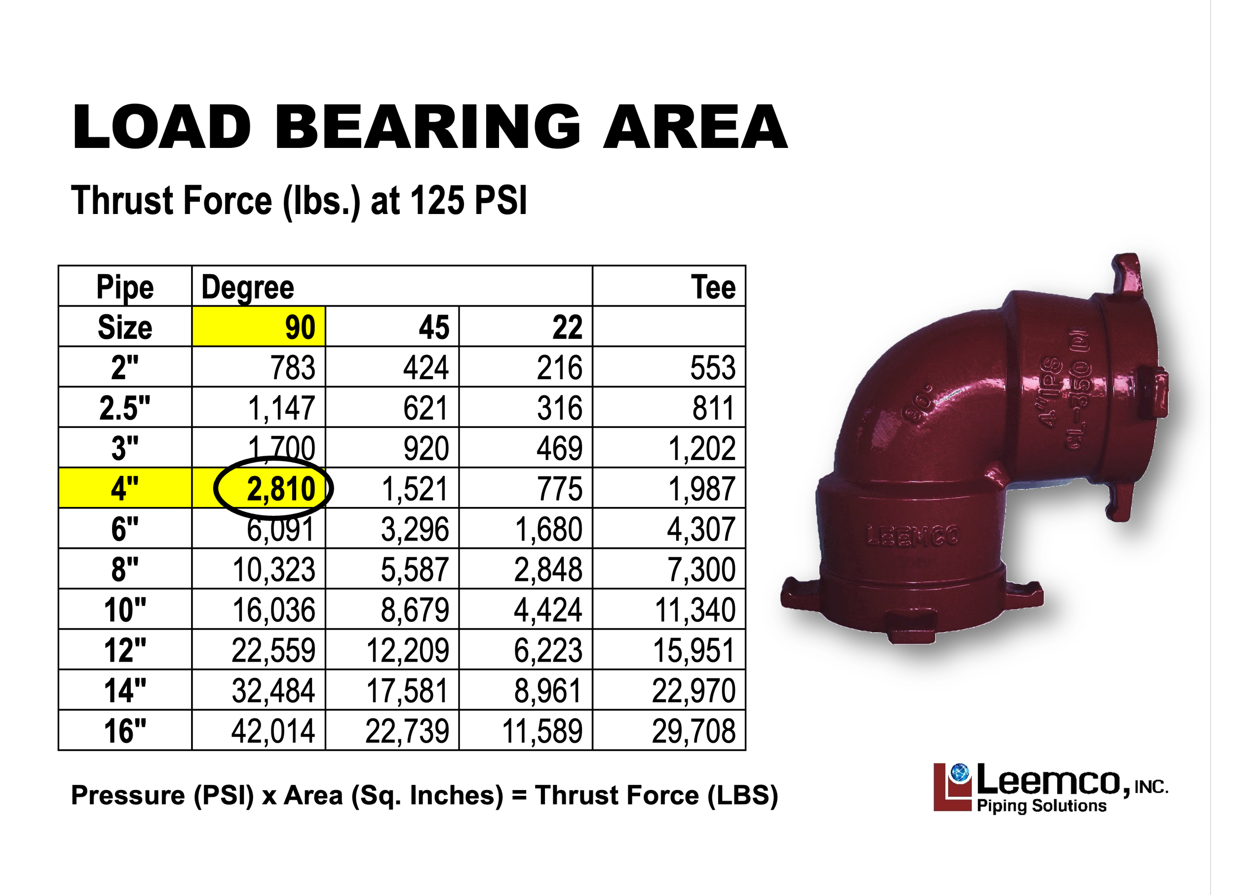 At any change of direction in the pipeline, that energy translates into thrust forces, and even modest systems generate significant loads. For example, a 4-inch 90-degree elbow can see thousands of pounds of force, and an 8-inch elbow may need to withstand upwards of 20,000 pounds in thrust force (see diagram below). And these loads aren’t occasional. In many irrigation systems, they are part of normal operation.